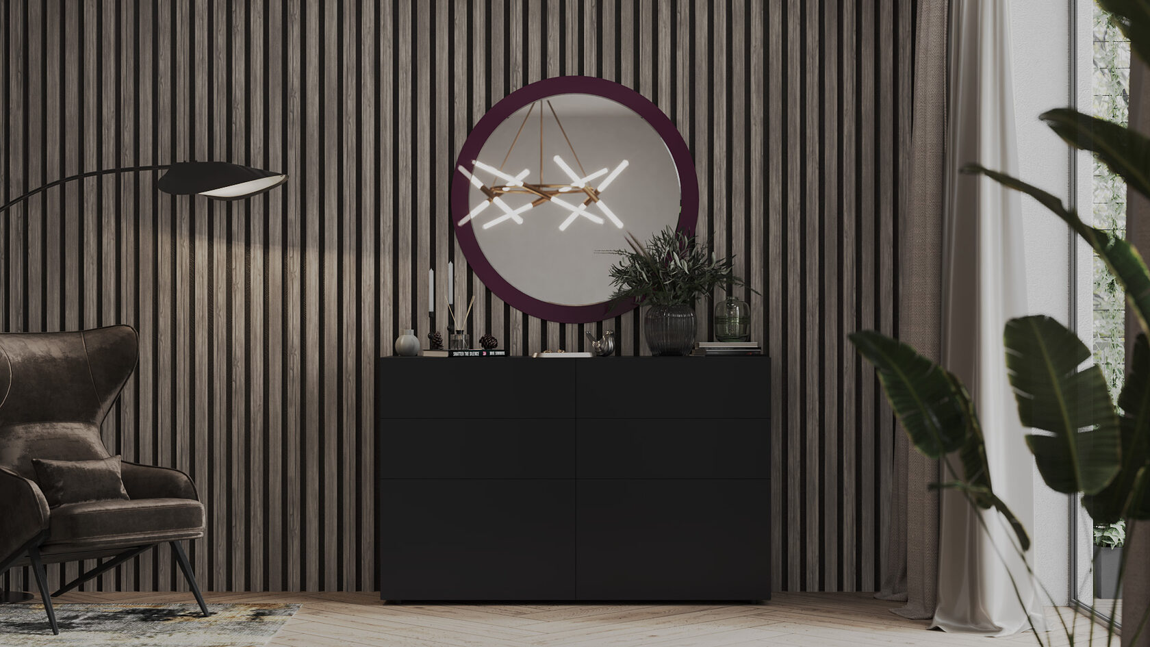 Идея: В узком пространстве прихожей рейки для стен создают уют и делают интерьер визуально выше. Светлый оттенок Тика Арагон отлично контрастирует с чёрным комодом и круглым зеркалом, формируя минималистичный и изысканный ансамбль.
