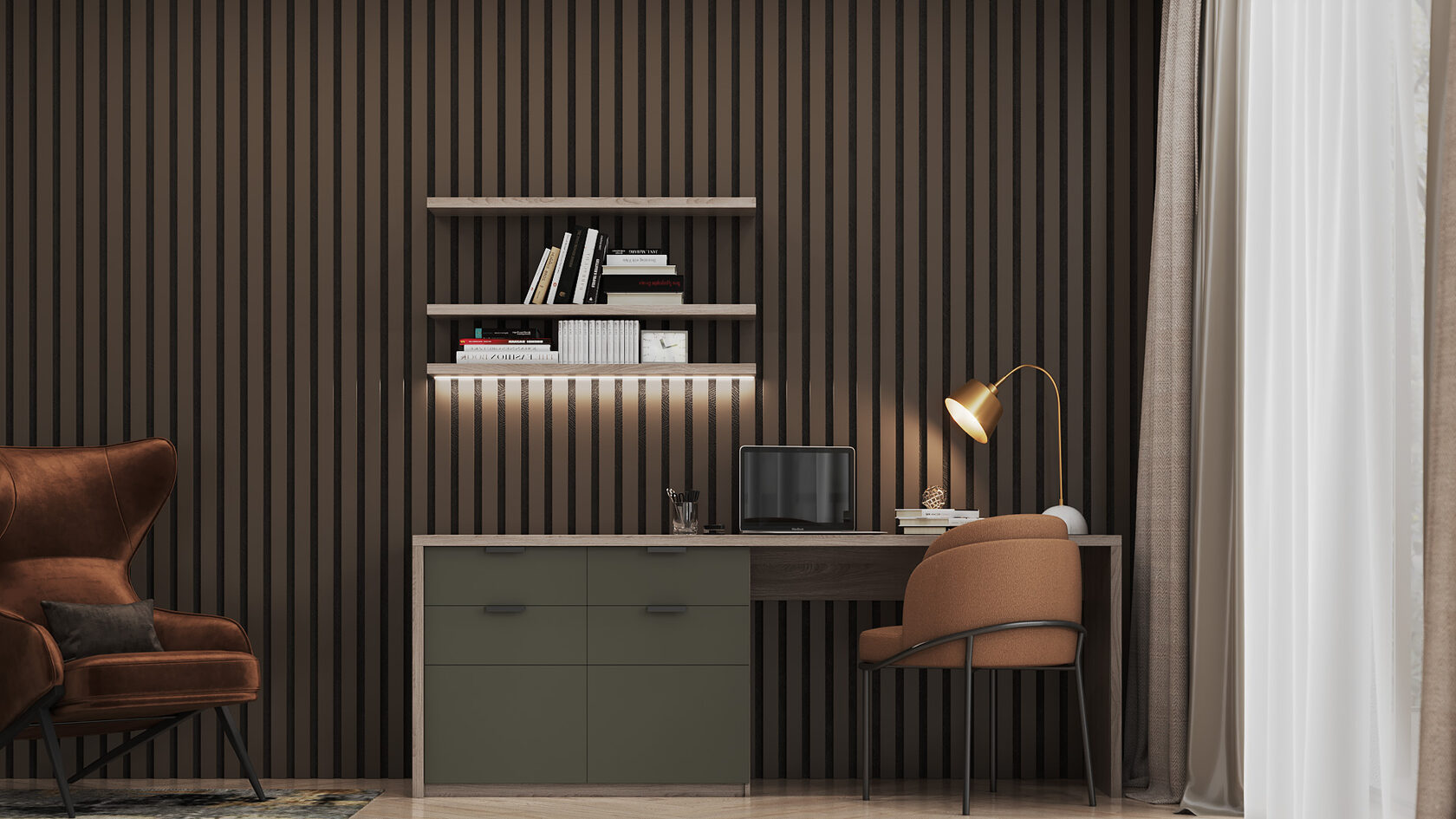 Идея: В рабочем кабинете вертикальные рейки на стене визуально зонируют пространство, помогая сфокусироваться. Матовая текстура поглощает лишний свет, создавая камерную атмосферу для продуктивной работы.