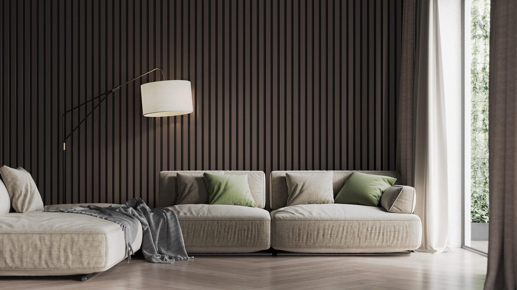 Идея: В гостиной деревянные рейки для стен помогают создать архитектурную выразительность без перегрузки деталями. На фоне белого дивана и светлого пола тёмные рейки выглядят благородно и добавляют интерьеру графичности.