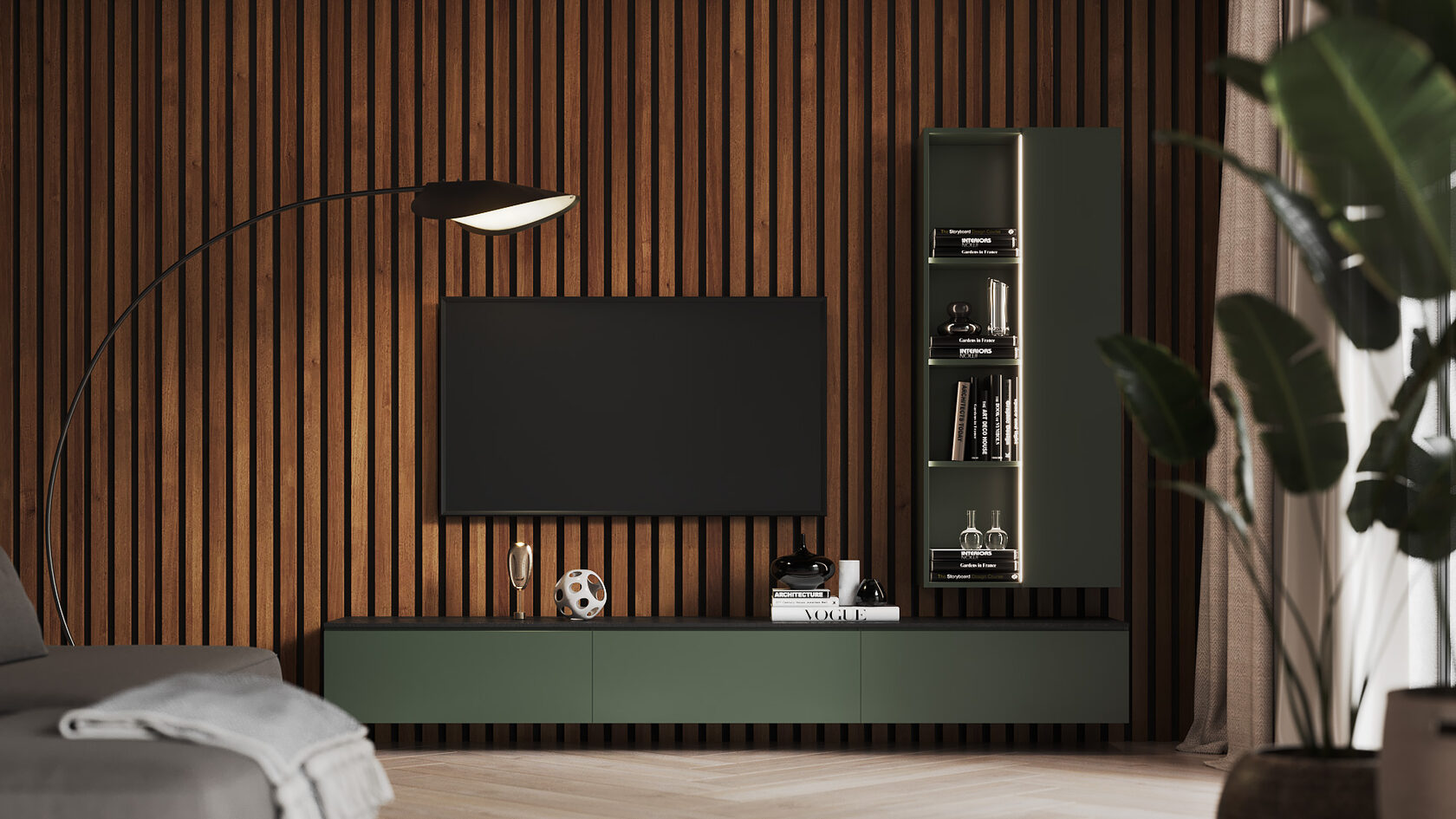 Идея: Сочетание реек Орех с зелёной стенкой создаёт эффектный дуэт — насыщенный, но не вычурный. Рейки для стен из МДФ добавляют глубину и подчёркивают цвет, делая интерьер богатым и уютным.