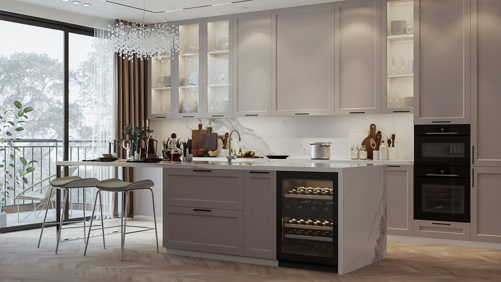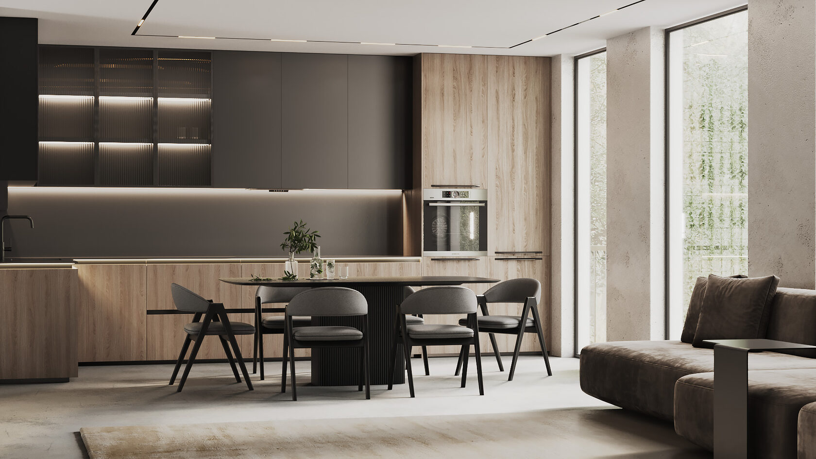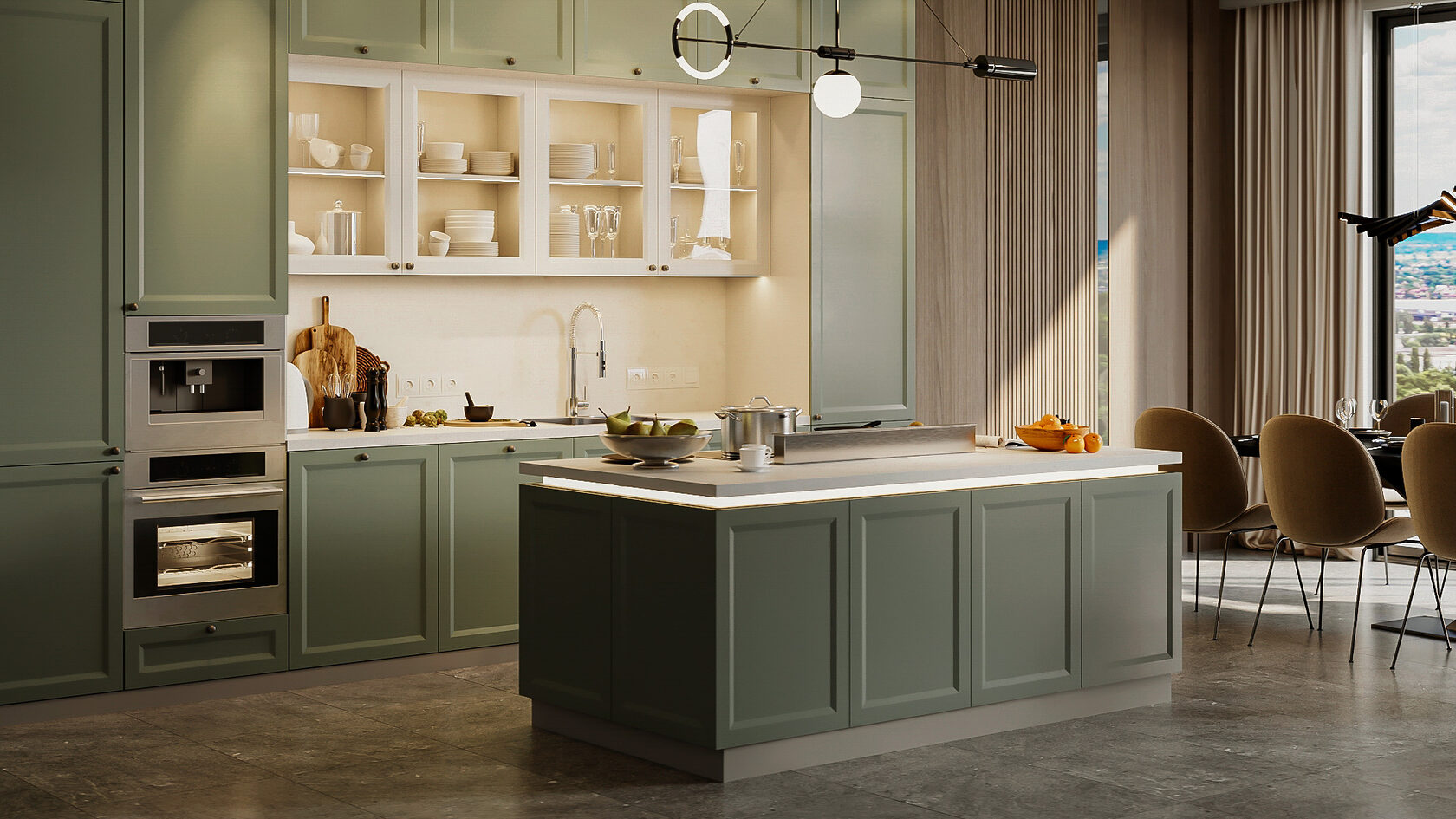 Совет: тёмные оттенки подчеркивают фактуру и глубину материалов. Они особенно эффектны в кухнях с большими окнами — там, где много естественного света.
