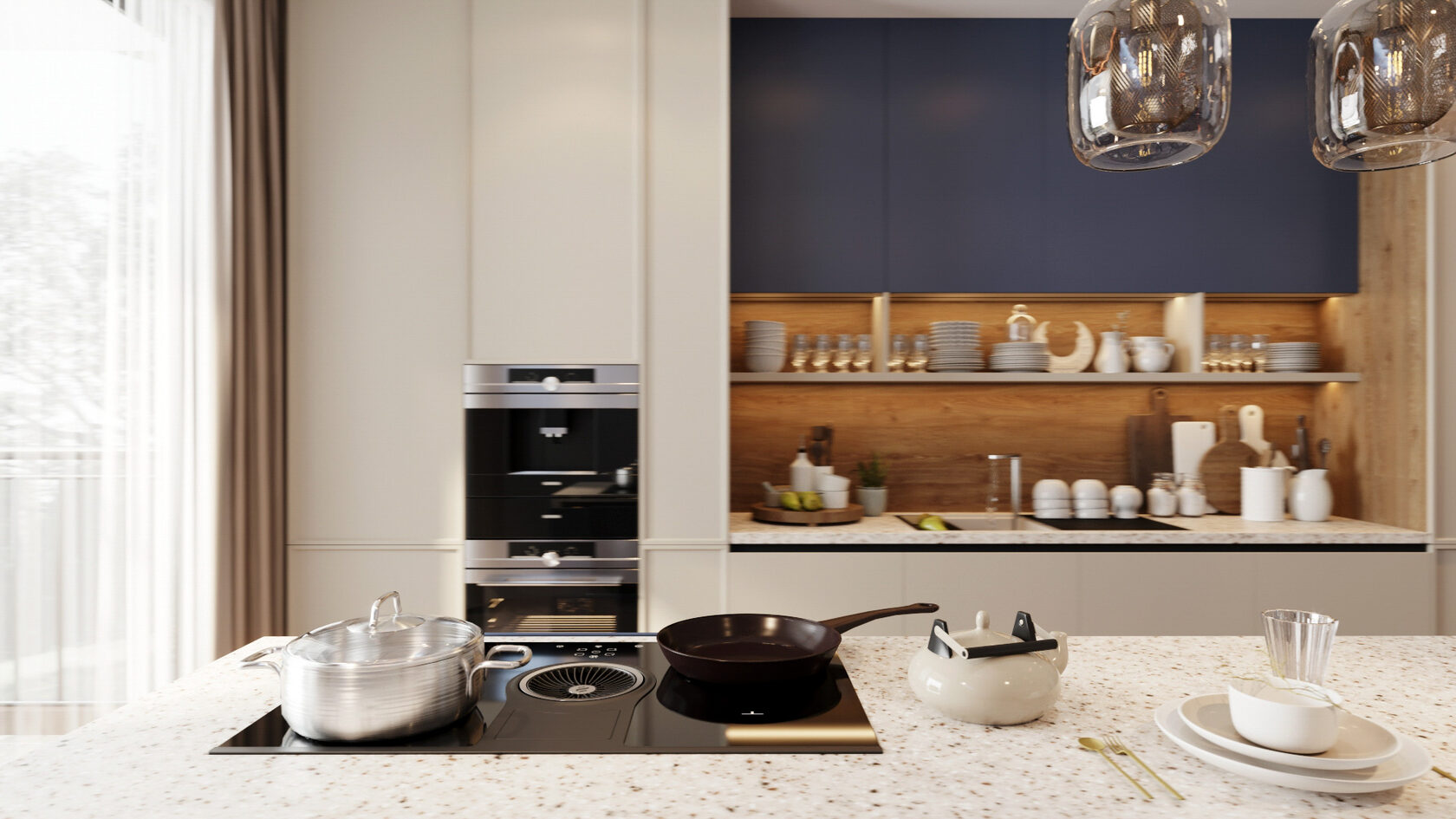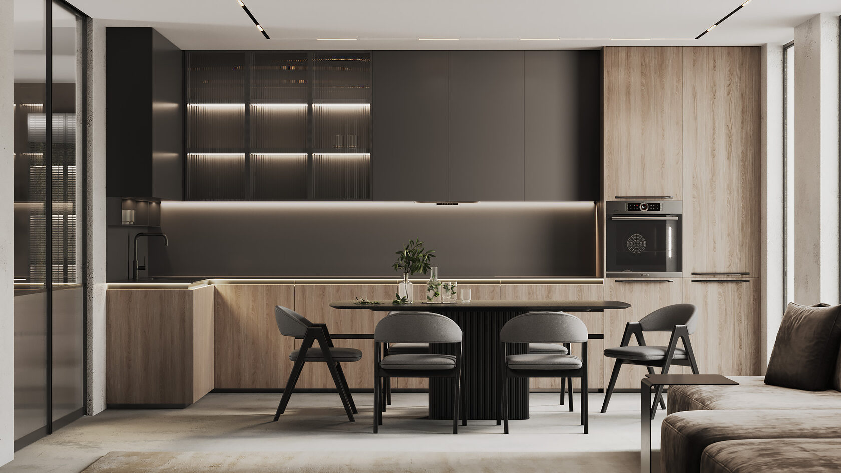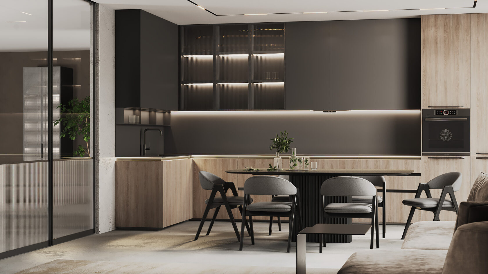 Совет: тёмные оттенки подчеркивают фактуру и глубину материалов. Они особенно эффектны в кухнях с большими окнами — там, где много естественного света.