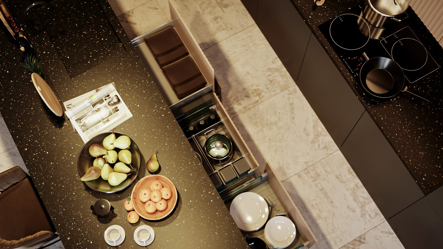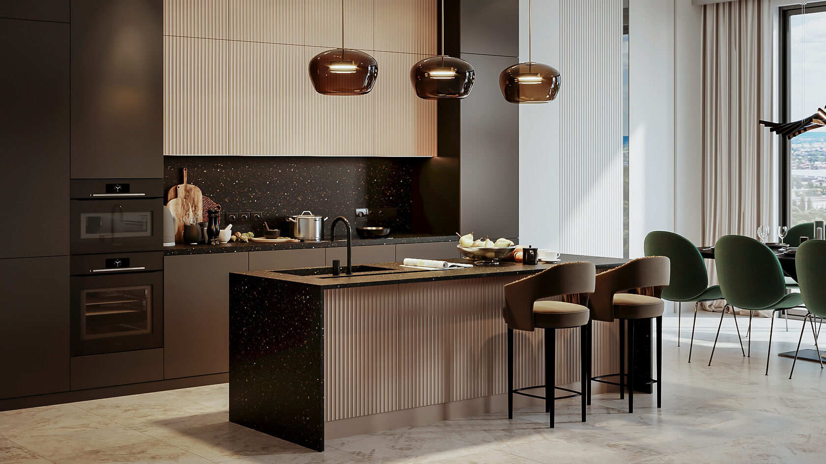 Решение: остров или барная стойка с фрезеровкой под рейки станет главным акцентом. Такой рисунок придаёт интерьеру глубину и делает кухню визуально выше. В сочетании с чёрной столешницей и бронзовой фурнитурой получается современно и изысканно.