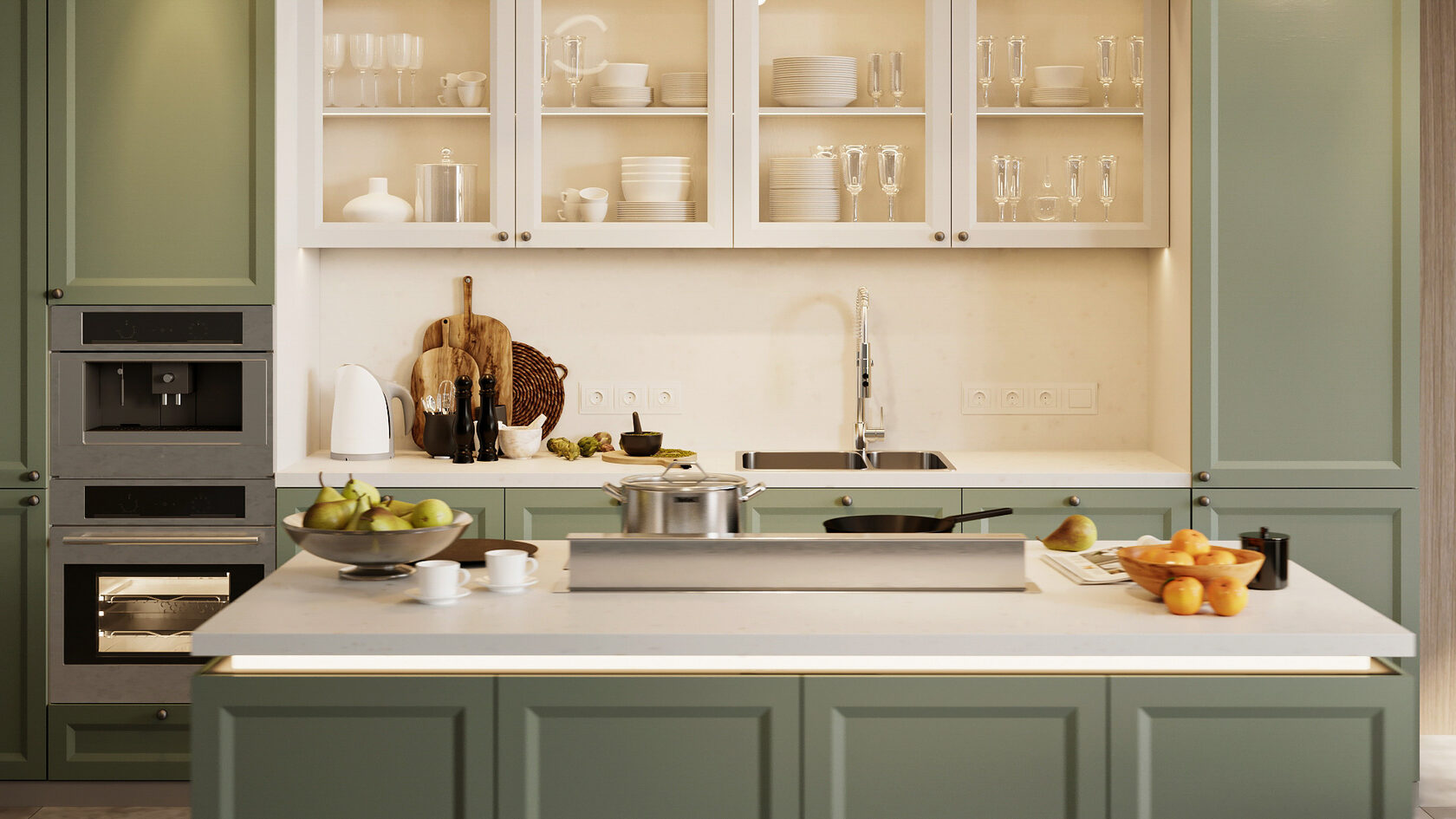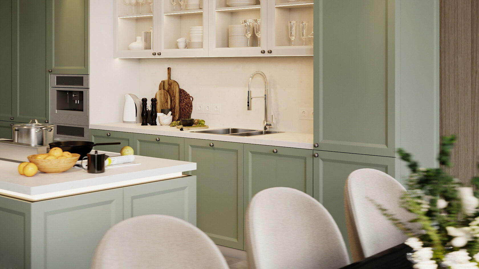 Совет: зелёный отлично работает с латунными элементами и камнем с тёплыми прожилками. Он уместен даже на маленьких кухнях — особенно в пастельных или оливковых оттенках.