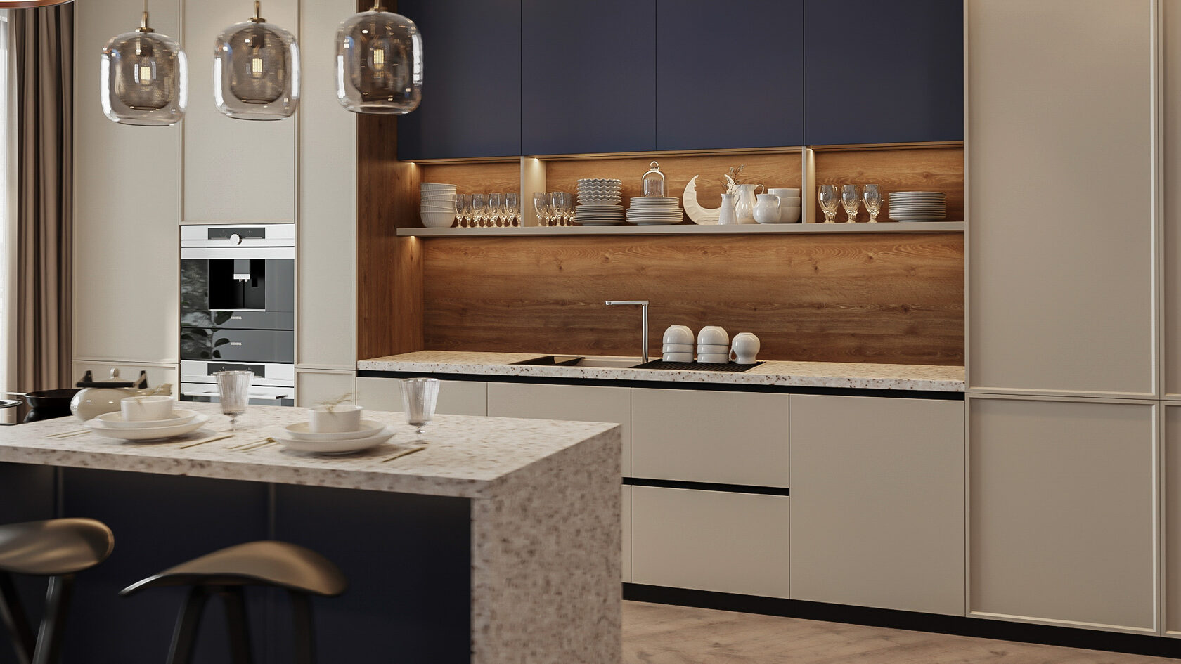 Решение: используйте синий на одном акцентном элементе — острове или нижних фасадах. Верхние шкафы выполните в бежевом или серо-песочном цвете, а фартук оформите в древесном декоре. Добавьте светлую столешницу под мрамор — и получите гармонию глубины и лёгкости.
