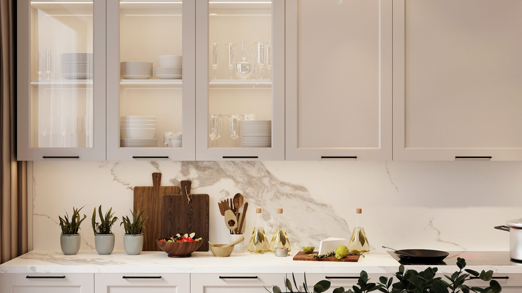 Решение: рамочные фасады в матовом исполнении, столешница и фартук под белый или серый мрамор, встроенная техника и ровная подсветка вдоль шкафов. Так кухня выглядит дорого, но без пафоса.