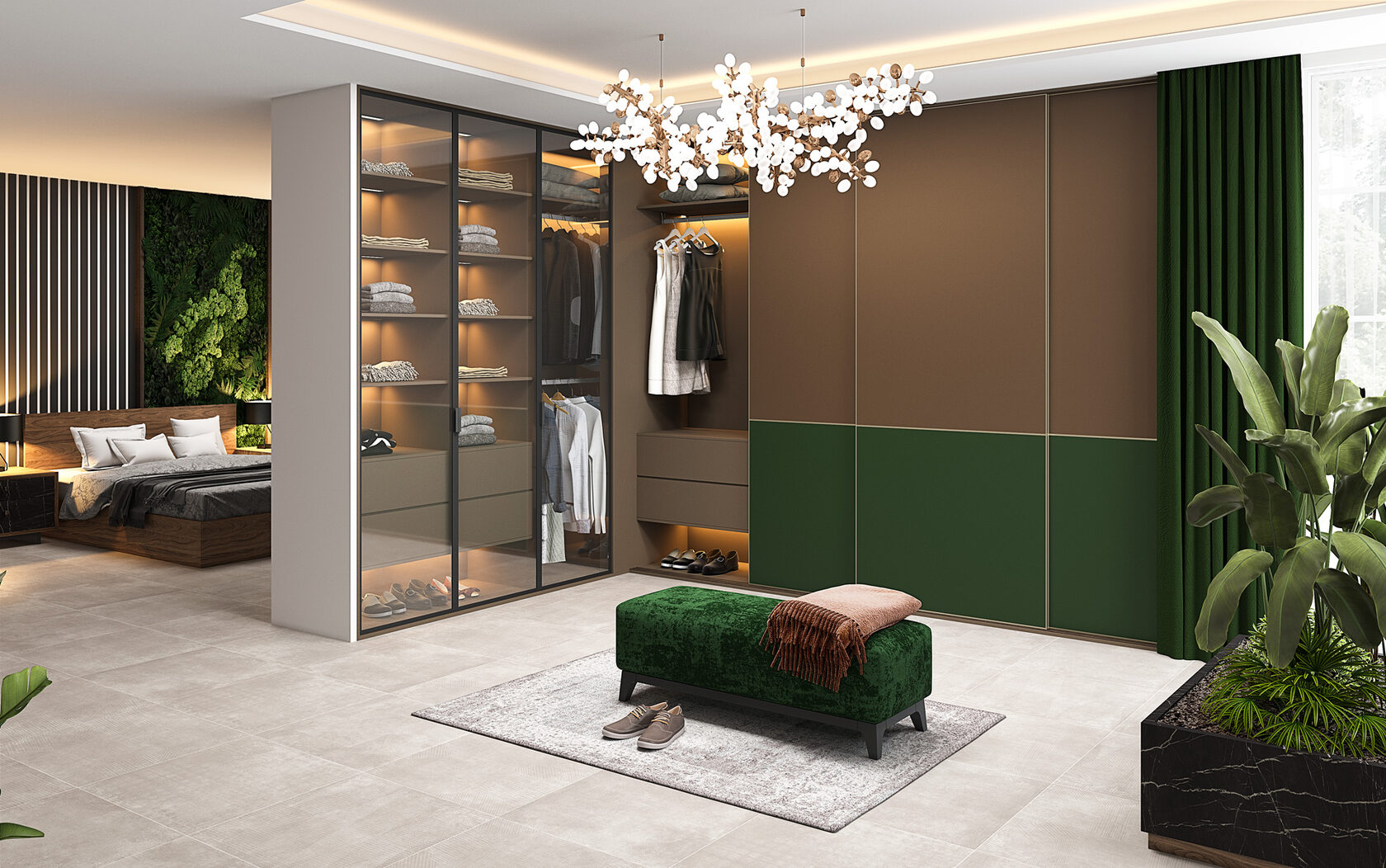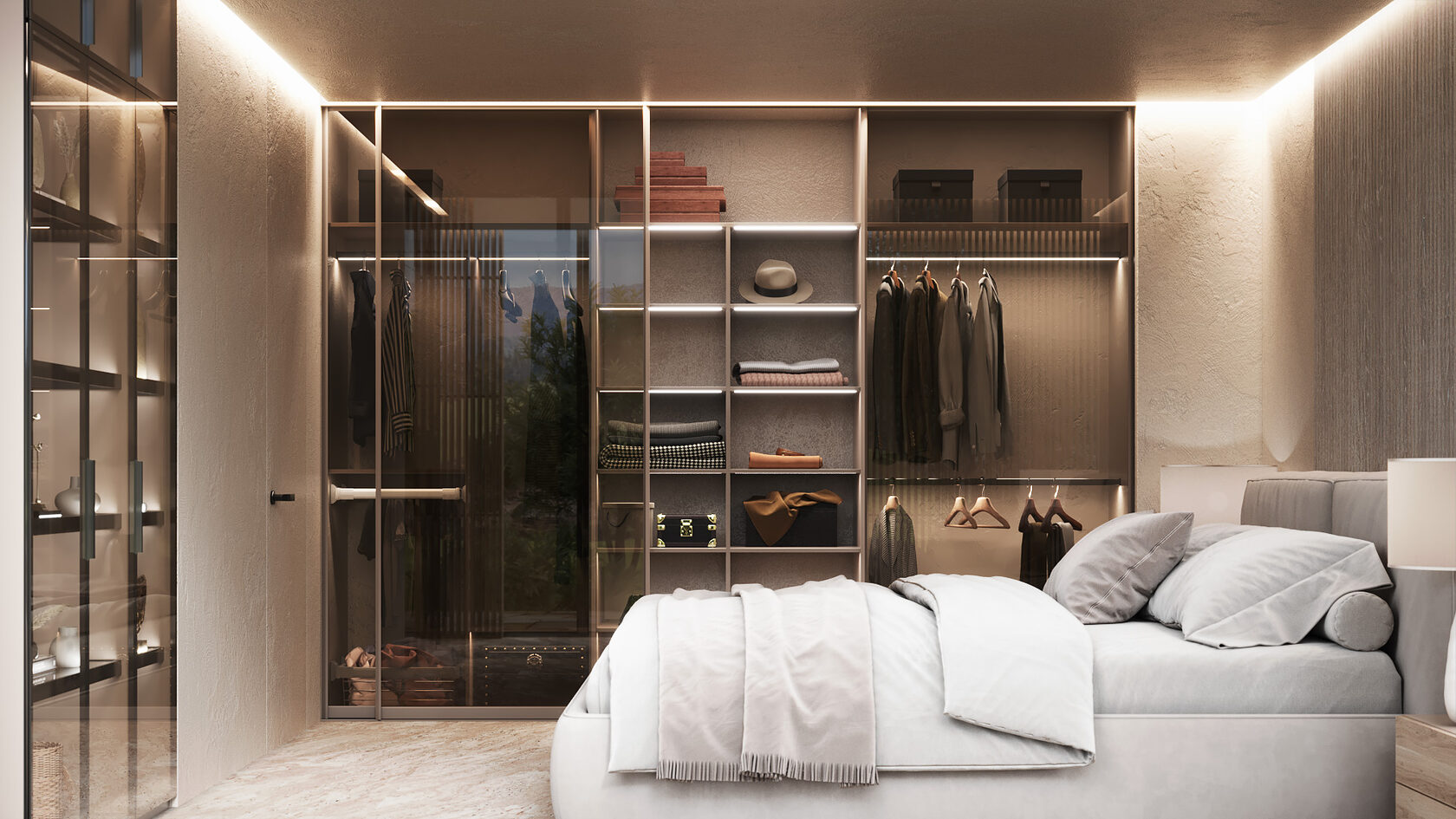 Отдельная гардеробная — это не роскошь, а логичное продолжение продуманного интерьера. Раздвижные стеклянные двери, симметричные ряды секций и центральный остров создают ощущение бутика.