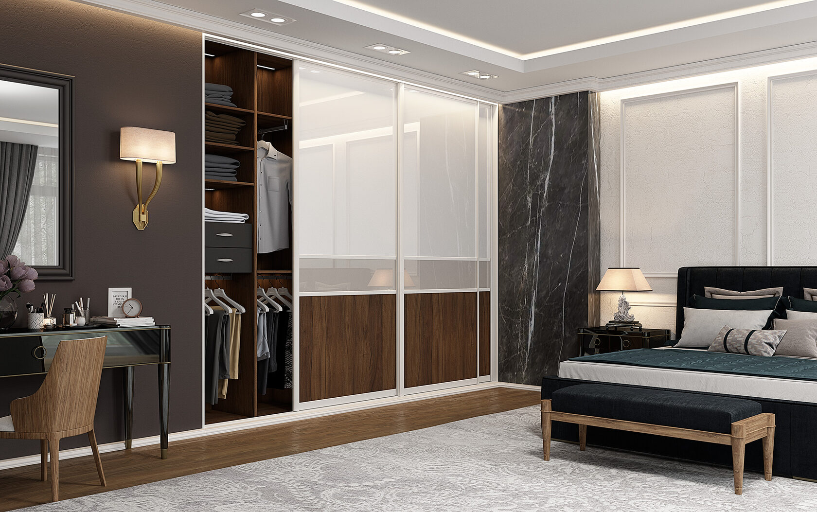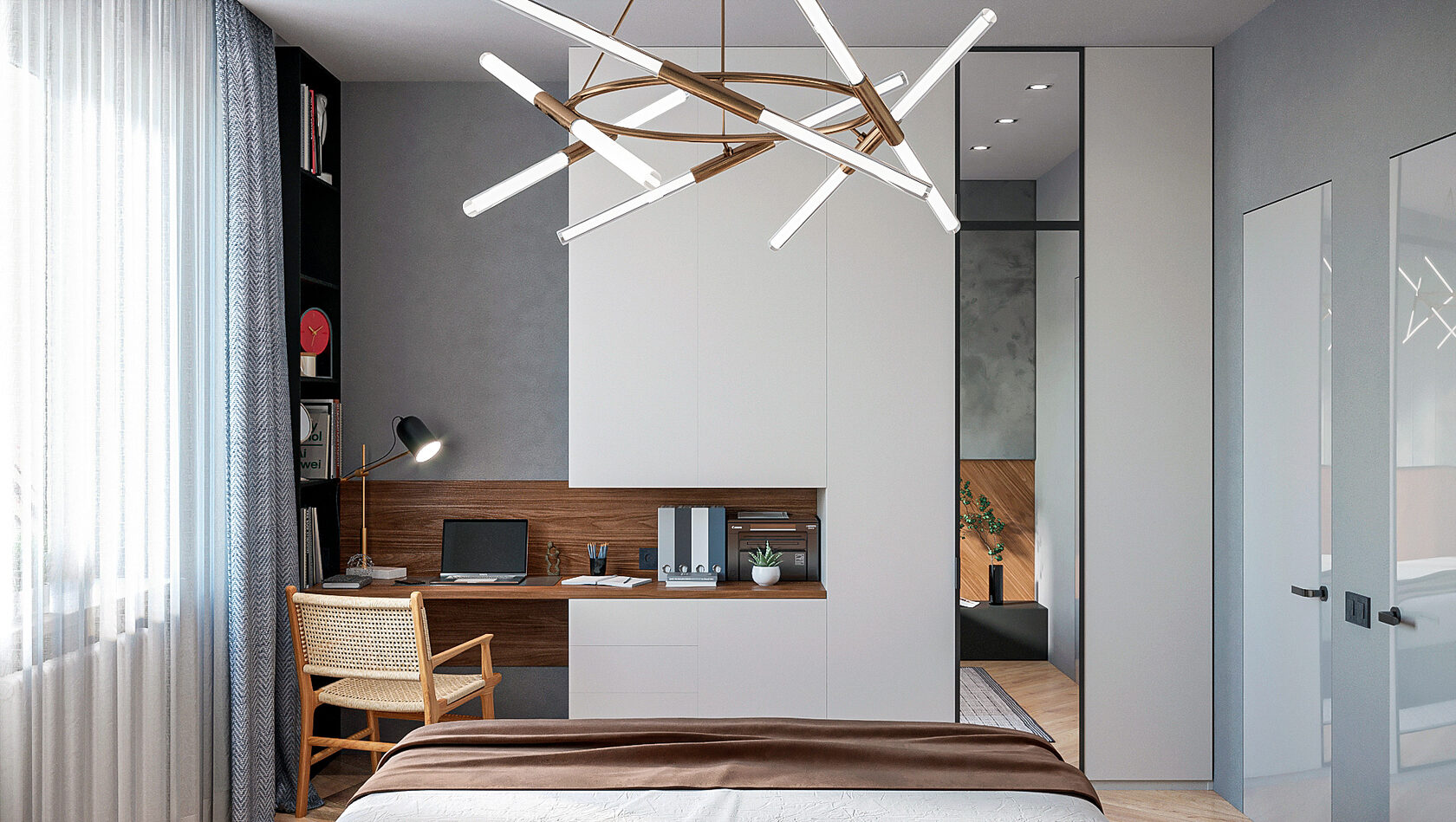 Для небольших спален или совмещённых пространств это идеальное решение. Встроенный стол продолжает линии шкафа, образуя единую композицию. Всё необходимое — под рукой, а интерьер остаётся чистым и гармоничным.