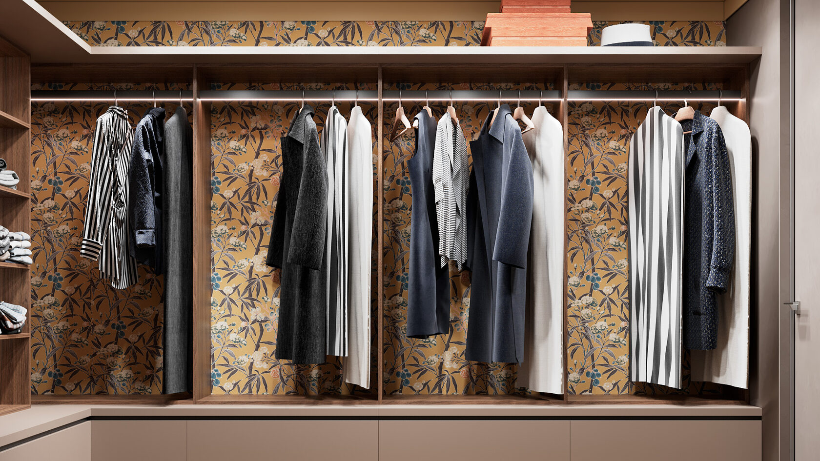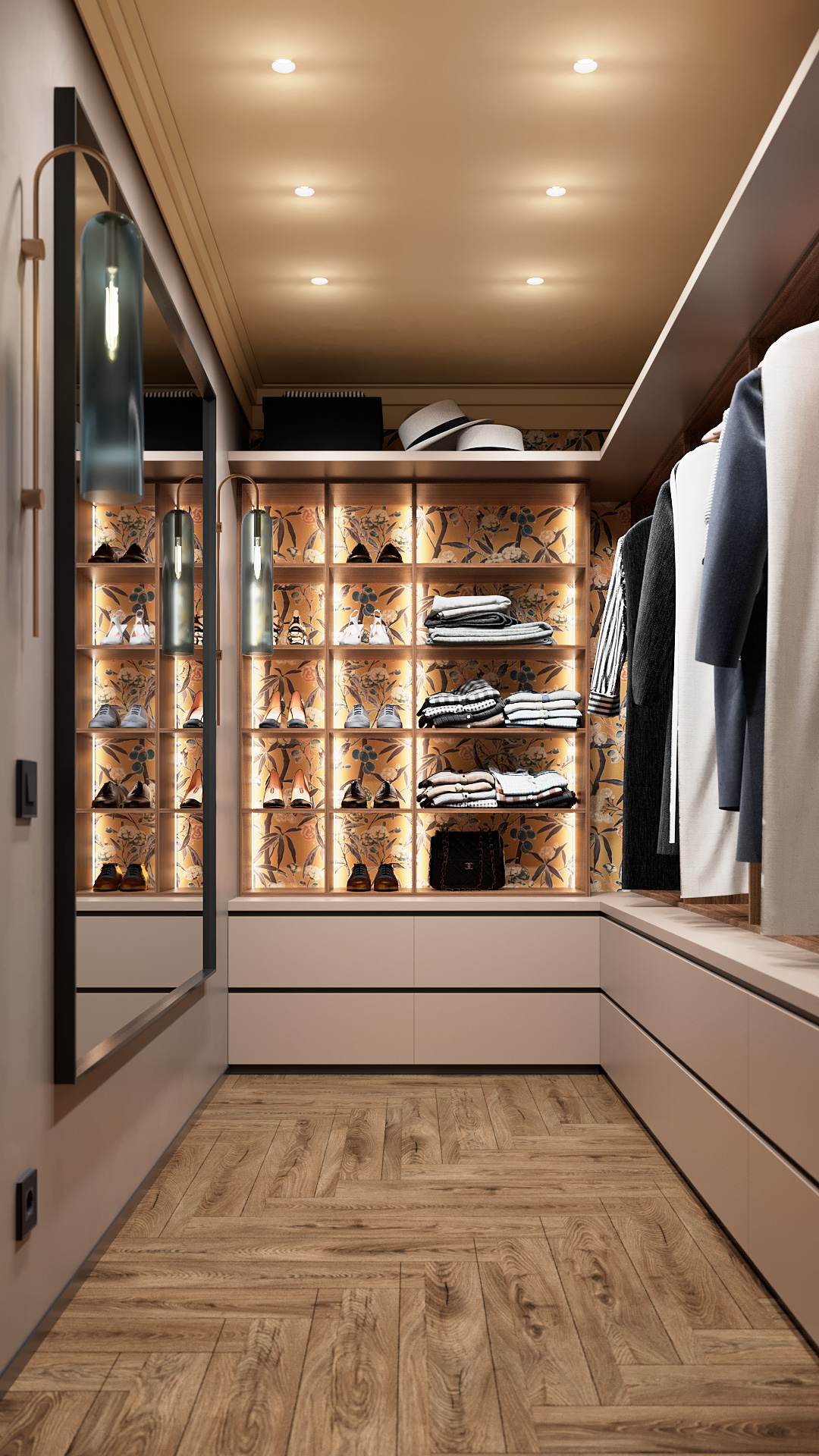 Эта гардеробная продумана до мелочей: секции под разные категории одежды, зеркало в полный рост, мягкая подсветка и отделка задней стенки обоями.