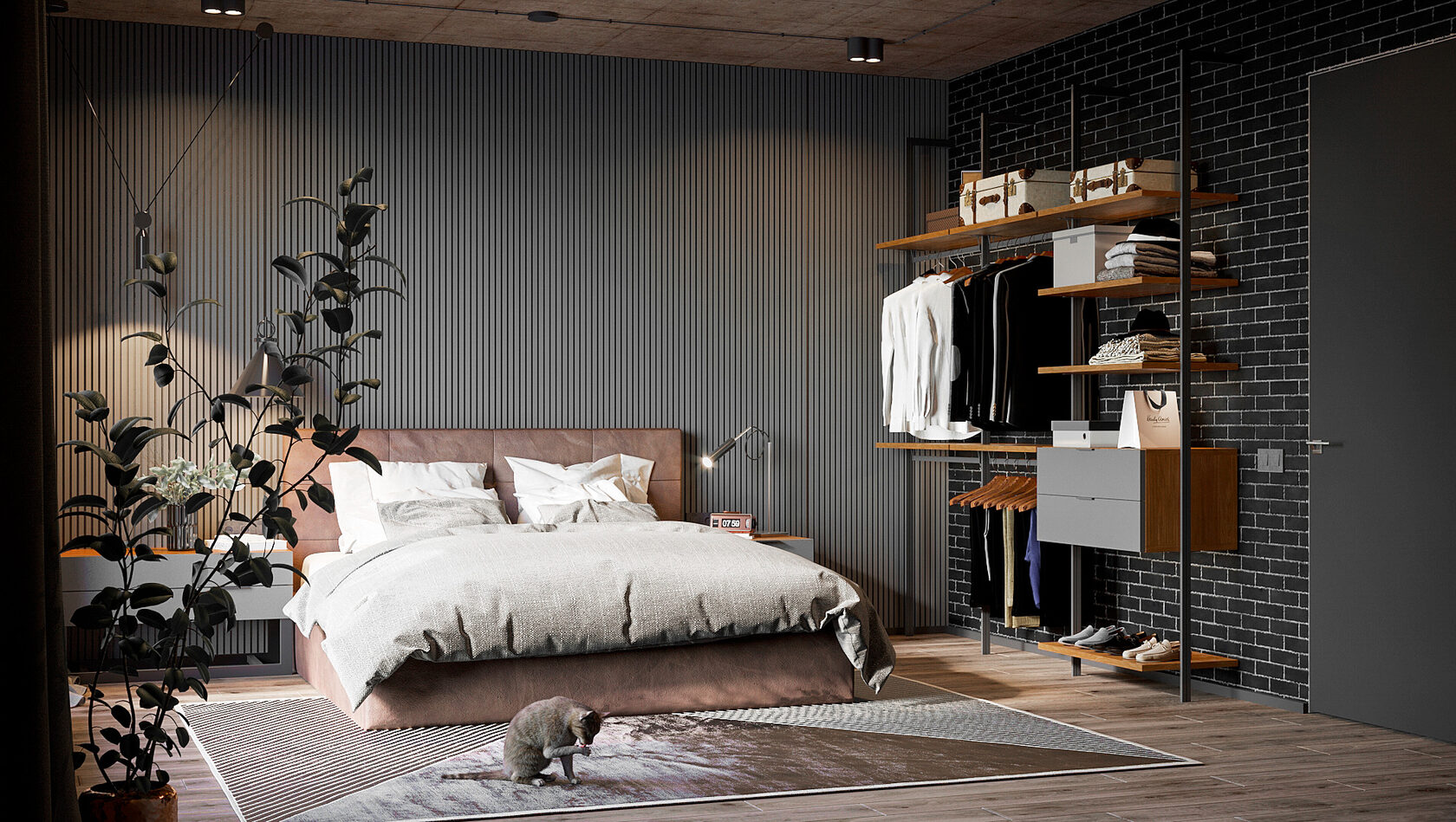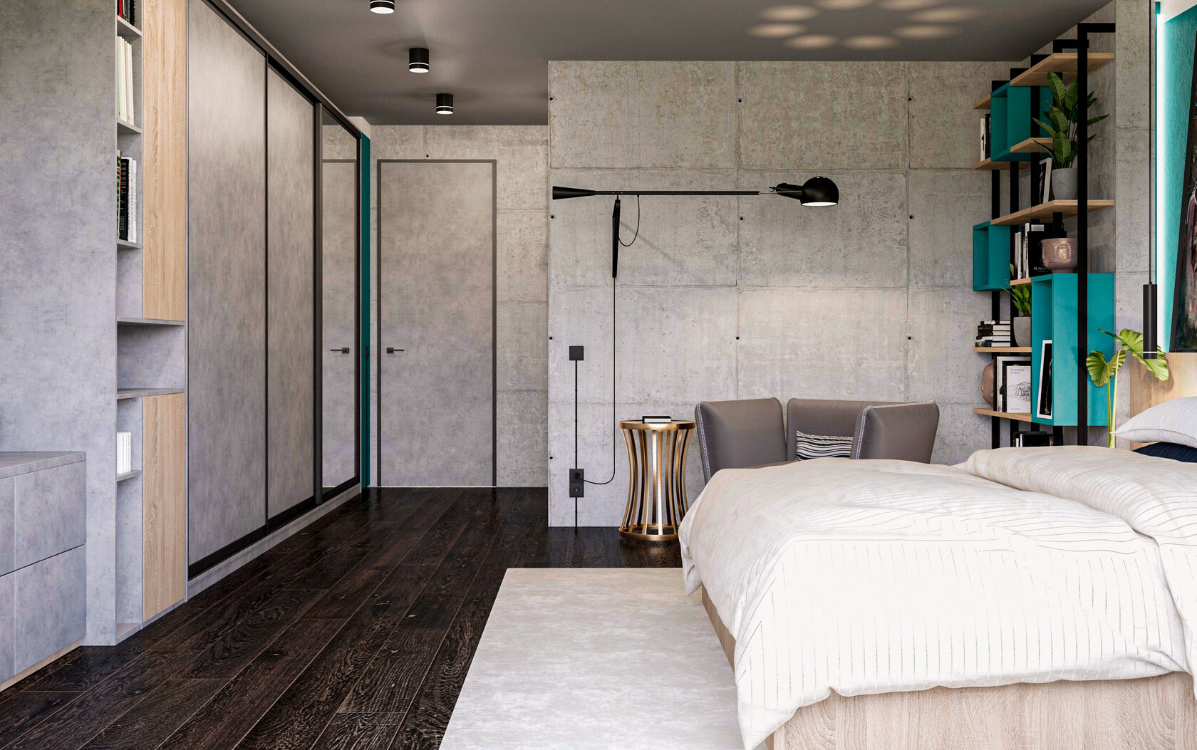 В квартирах-студиях шкаф может выполнять роль перегородки, отделяя спальню от прихожей или гостиной. Фасад под бетон или древесину делает конструкцию выразительной, а открытые полки создают уют и добавляют функциональности.