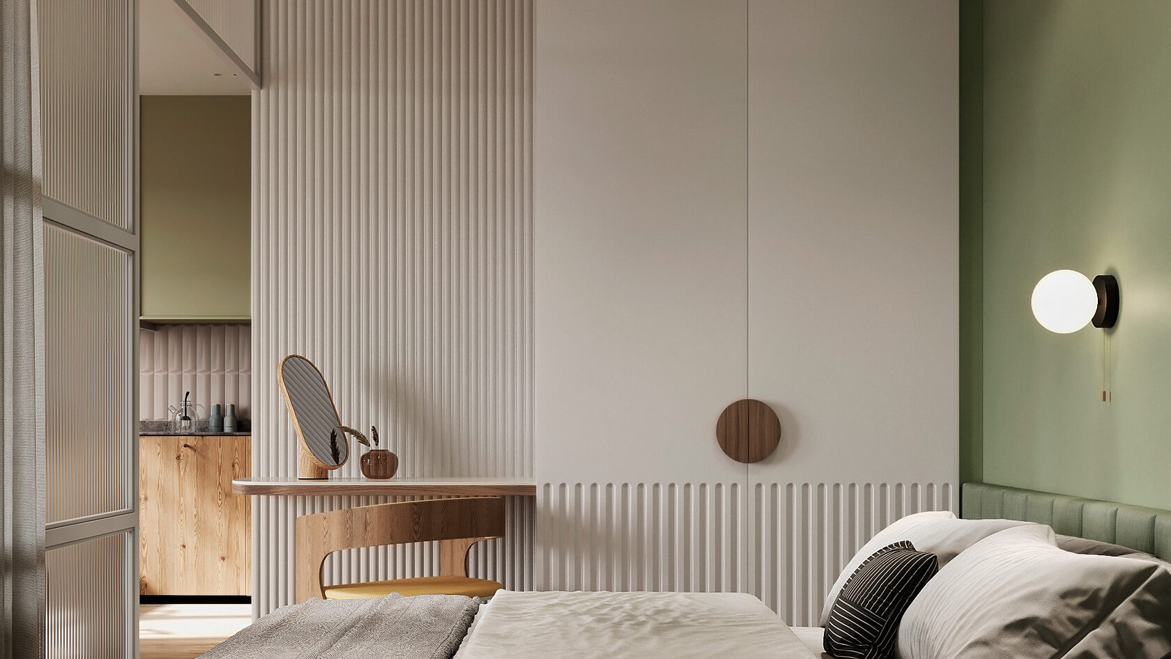 Когда фасады совпадают по цвету со стенами, мебель буквально растворяется в интерьере. Это приём, который часто используют дизайнеры в минималистичных проектах: он помогает сохранить ощущение целостности и покоя.