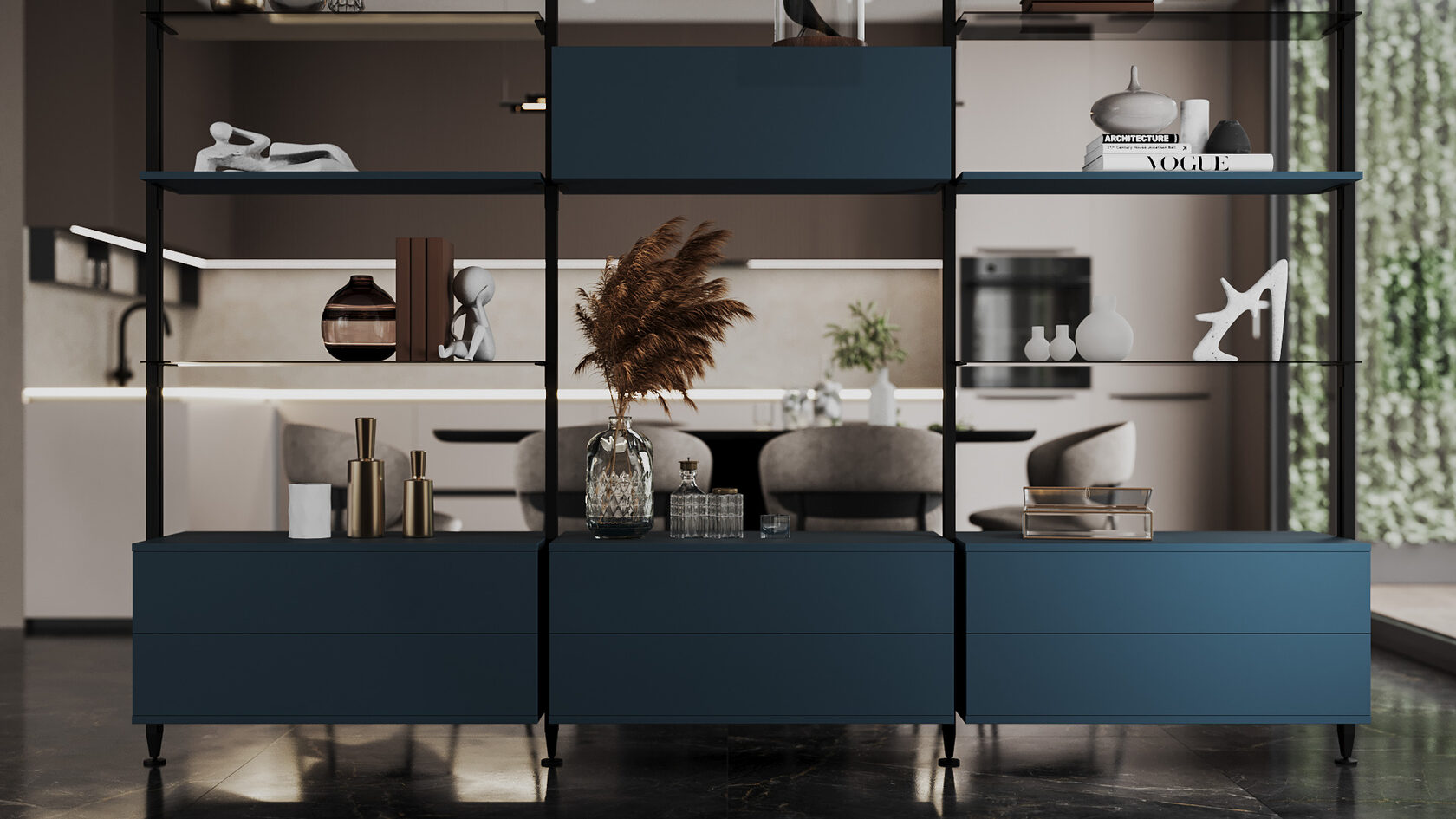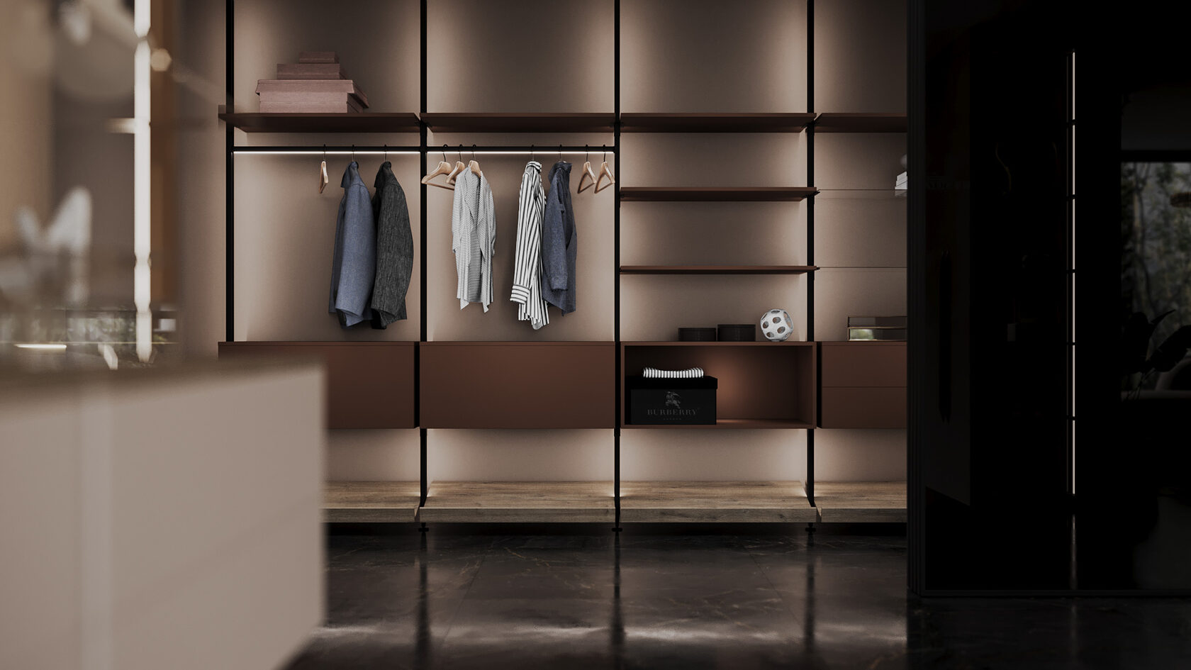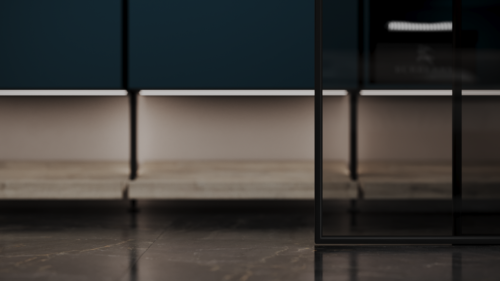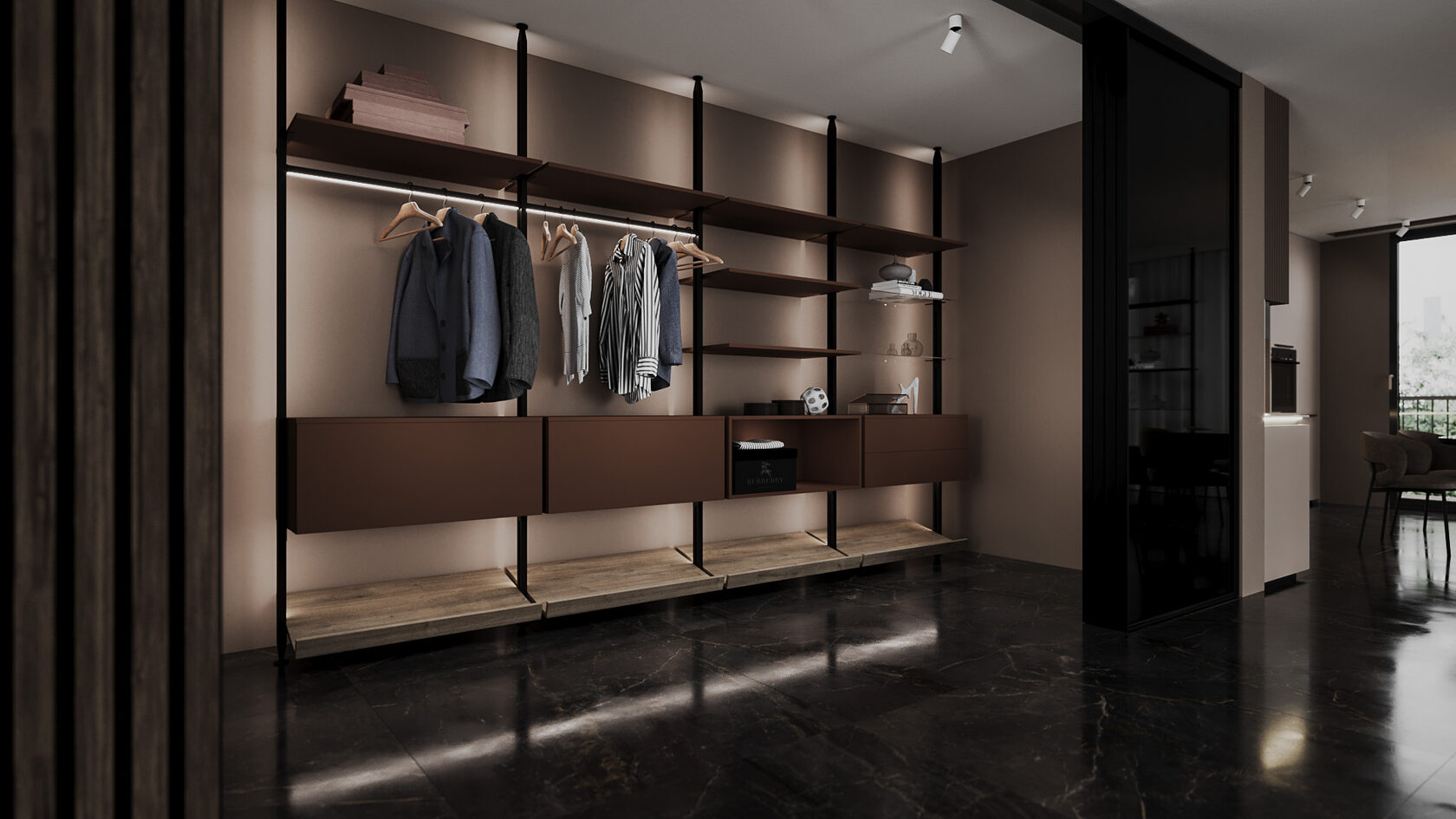 Благодаря легкой конструкции из алюминиевого профиля, точной геометрии и универсальным анодированным цветам, такая система не выглядит как типичная мебель, а становится частью архитектуры интерьера. Особенно эффектно она смотрится в открытом виде или с раздвижными дверями с тонированным стеклом, которые не скрывают содержимое, а мягко его фильтруют. Ниже — пять реальных сценариев, как одна и та же система работает в разных ролях.