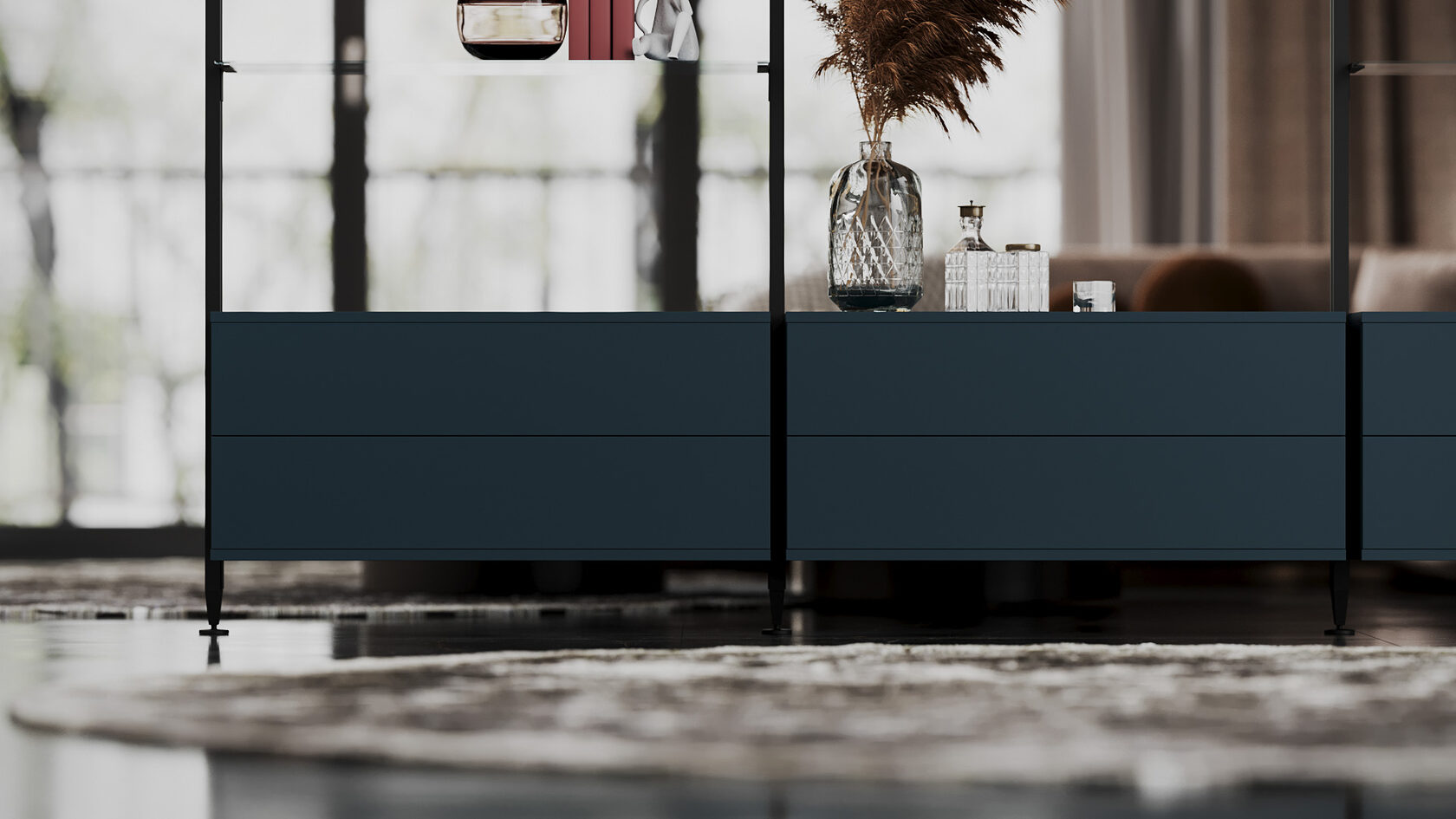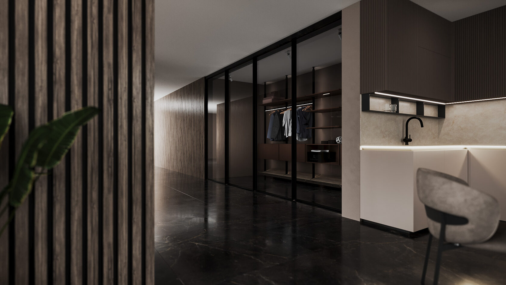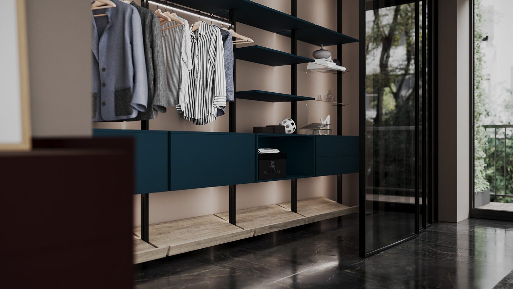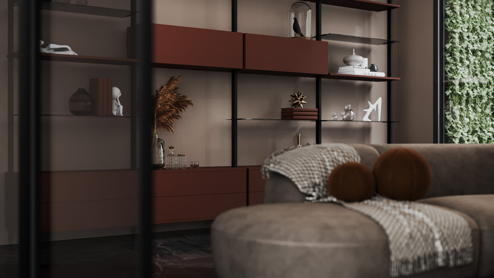Благодаря легкой конструкции из алюминиевого профиля, точной геометрии и универсальным анодированным цветам, такая система не выглядит как типичная мебель, а становится частью архитектуры интерьера. Особенно эффектно она смотрится в открытом виде или с раздвижными дверями с тонированным стеклом, которые не скрывают содержимое, а мягко его фильтруют. Ниже — пять реальных сценариев, как одна и та же система работает в разных ролях.