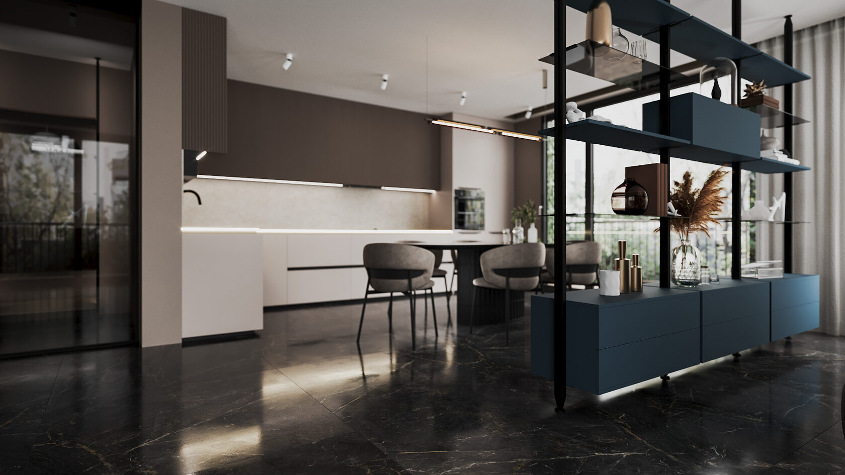 Пространство остаётся единым, но при этом — зрительно упорядоченным. А если добавить раздвижные двери из стекла, можно временно изолировать кухню — например, во время готовки — без потери света и стиля.