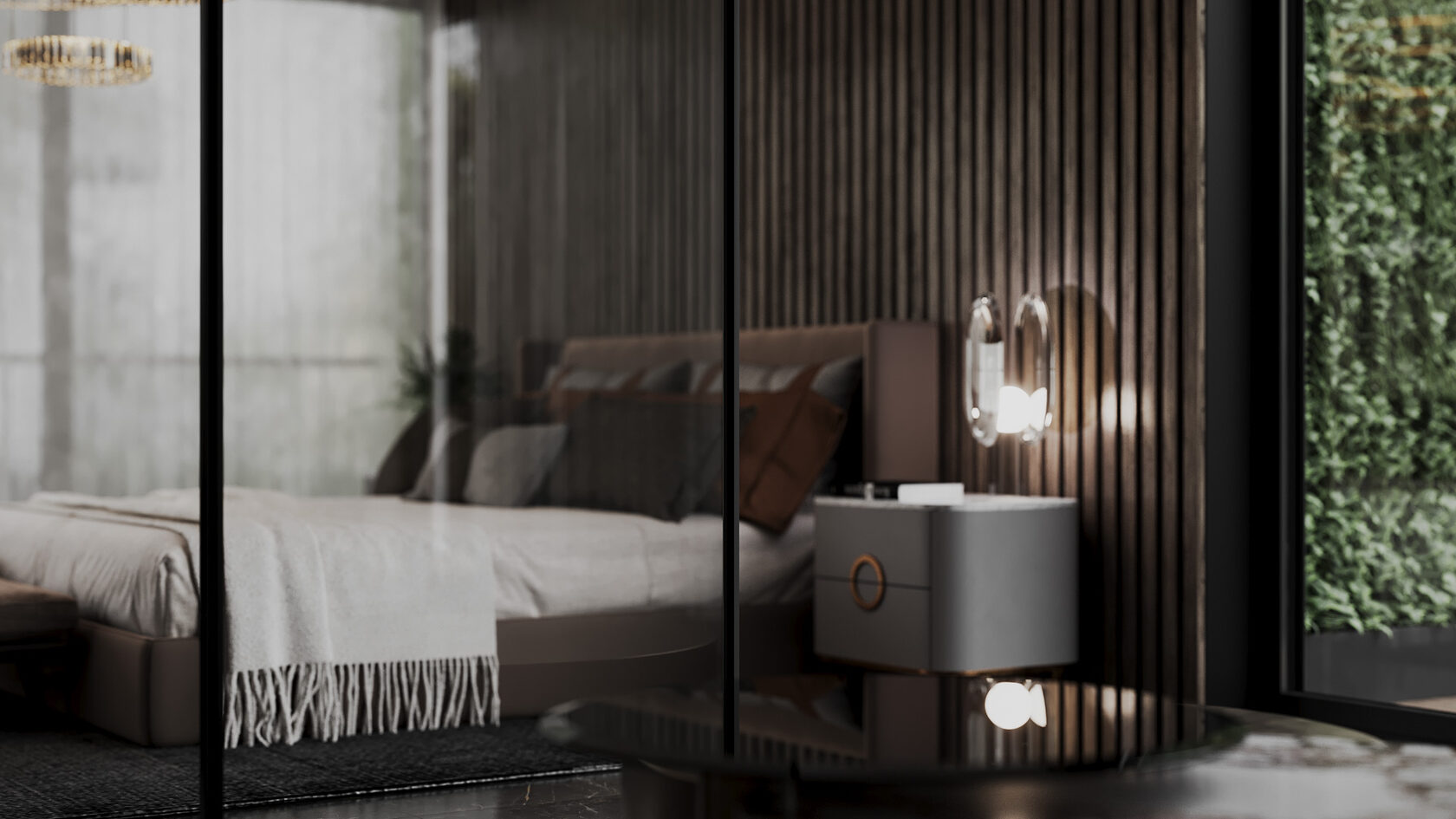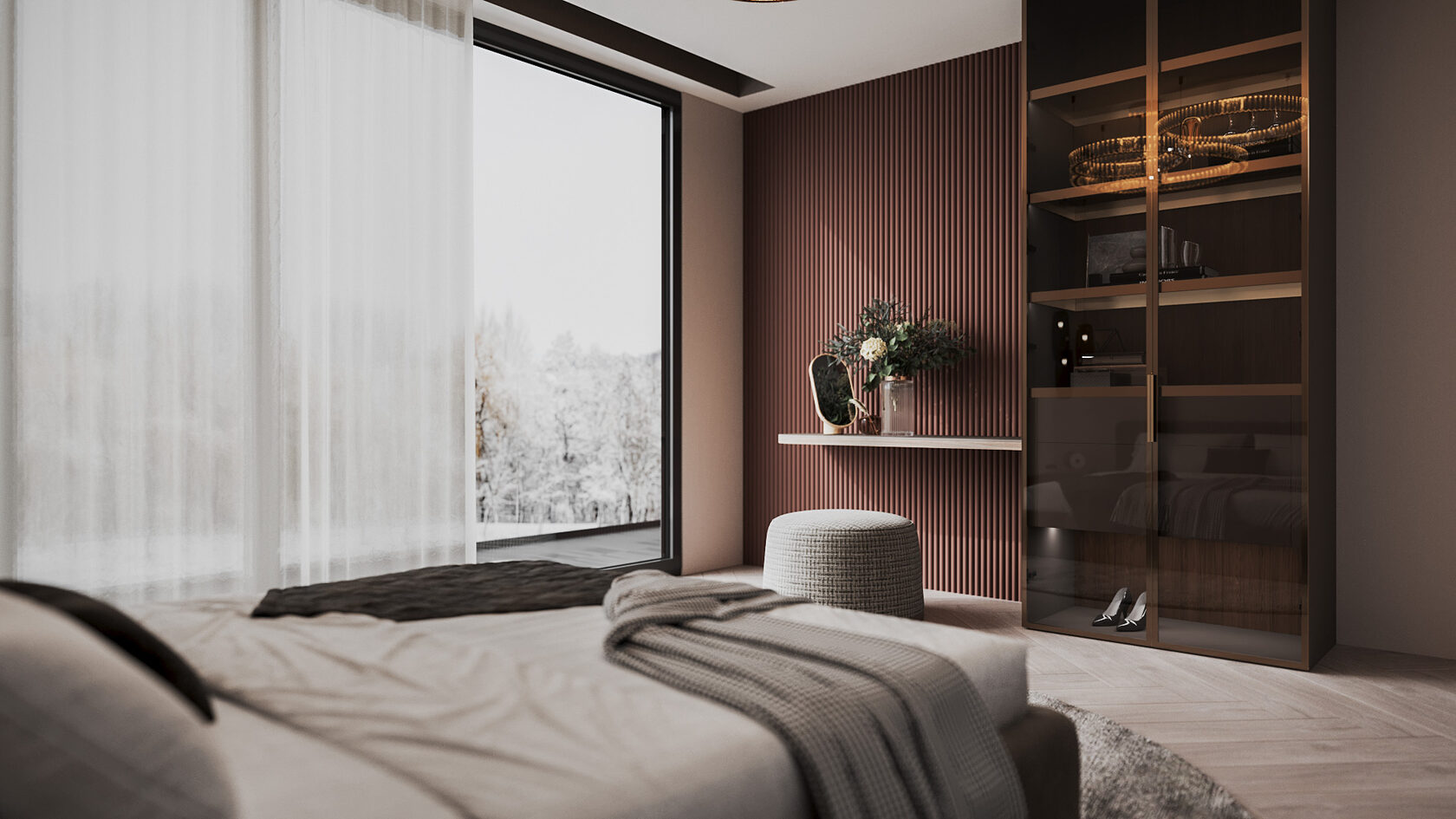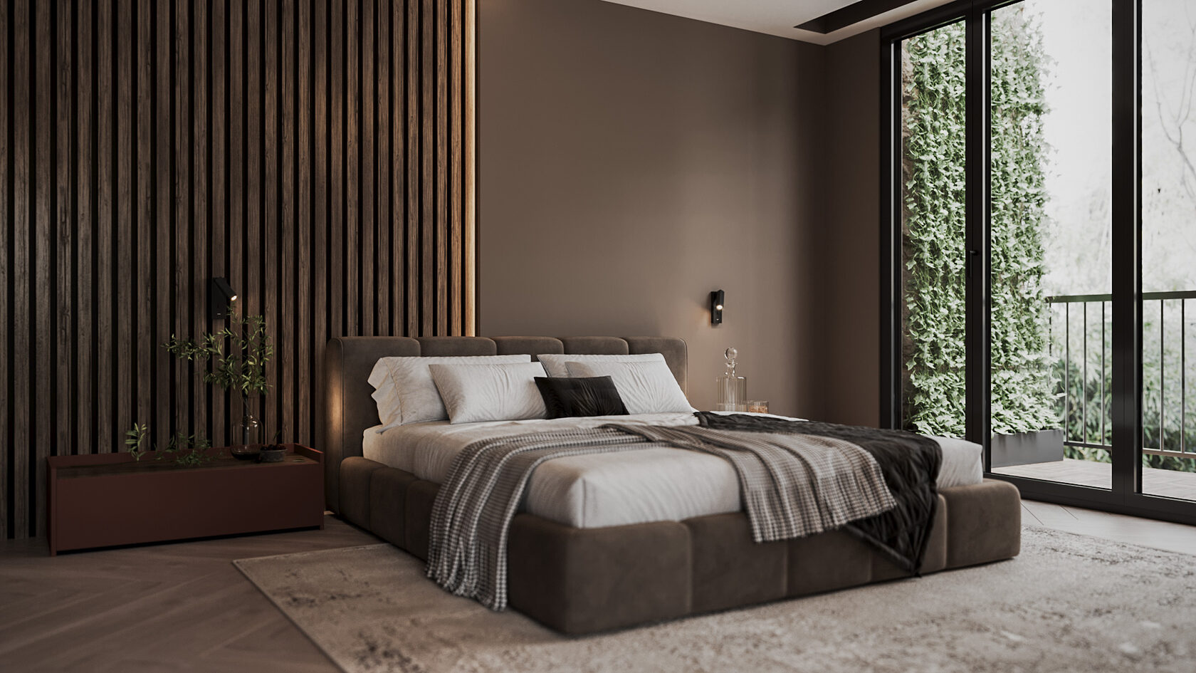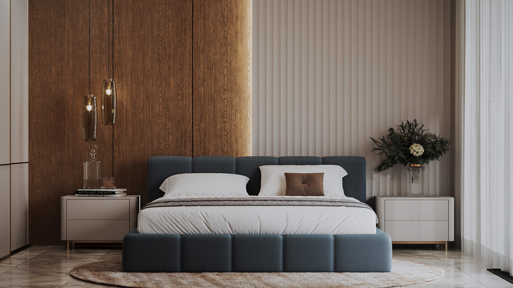 Визуальный эффект: вертикальные рейки визуально «поднимают» потолок. Мягкие панели в ткани делают зону сна более камерной и уютной.