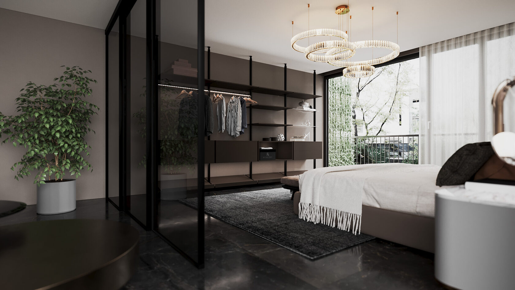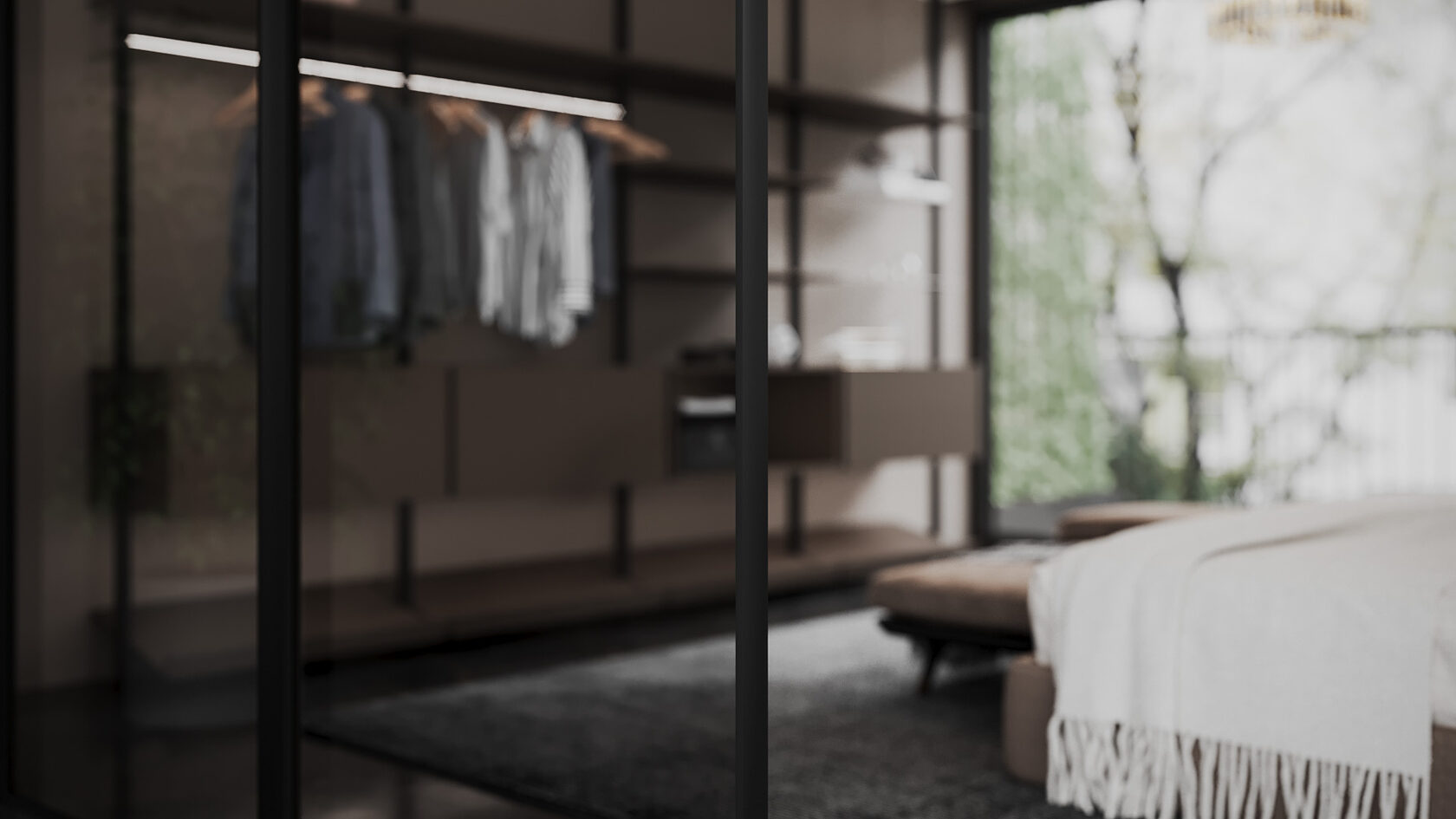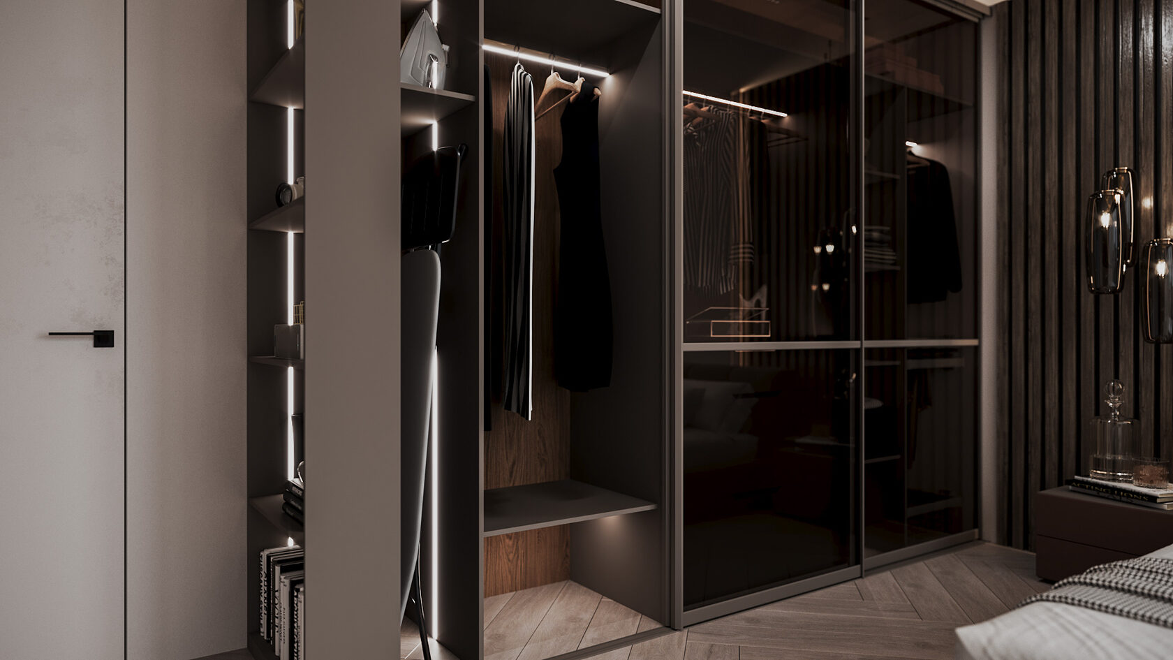 - Закройте проем подвесными раздвижными дверями с тонированным стеклом — когда закрыты, создают единую стену; когда открыты — открывают доступ к гардеробной.