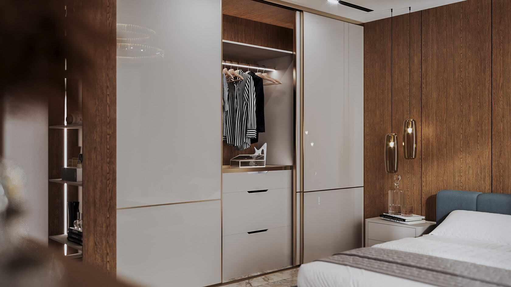 Когда выбирать: если спальня узкая или кровать стоит близко к шкафу.