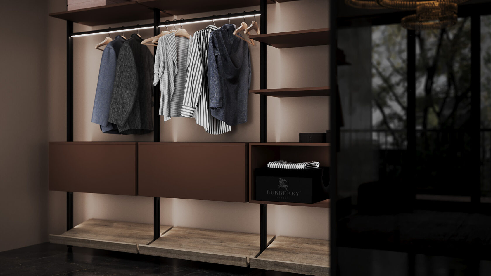 - Если хотите легкости — открытая гардеробная с модульной системой.