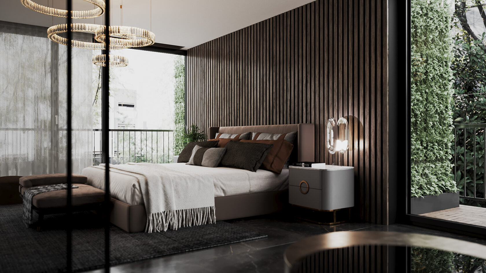 - Акцентная стена за изголовьем кровати — темные деревянные рейки создают глубину и фактуру.
