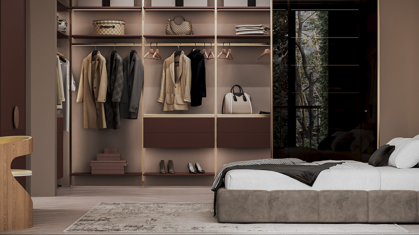 Тренд последних лет, пришедший из отельных интерьеров. Это система штанг и полок без внешних дверей или с минимальным остеклением.